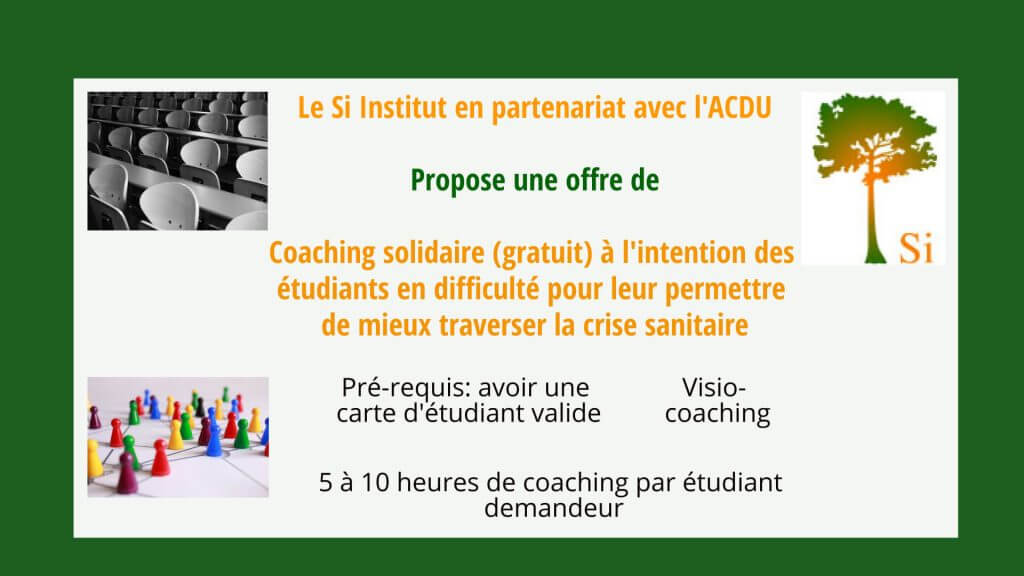Vous êtes étudiant et vous vous trouvez en difficulté du fait de la crise sanitaire. Contactez-nous afin que nous vous mettions en relation avec un coach certifié pour vous accompagner (accompagnement intégralement gratuit).